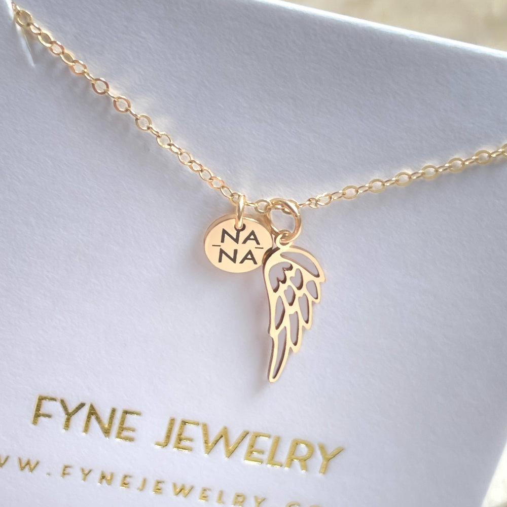 This delicate angel wing charm is paired with a personalised tiny disk, both crafted in radiant 14k gold fill.