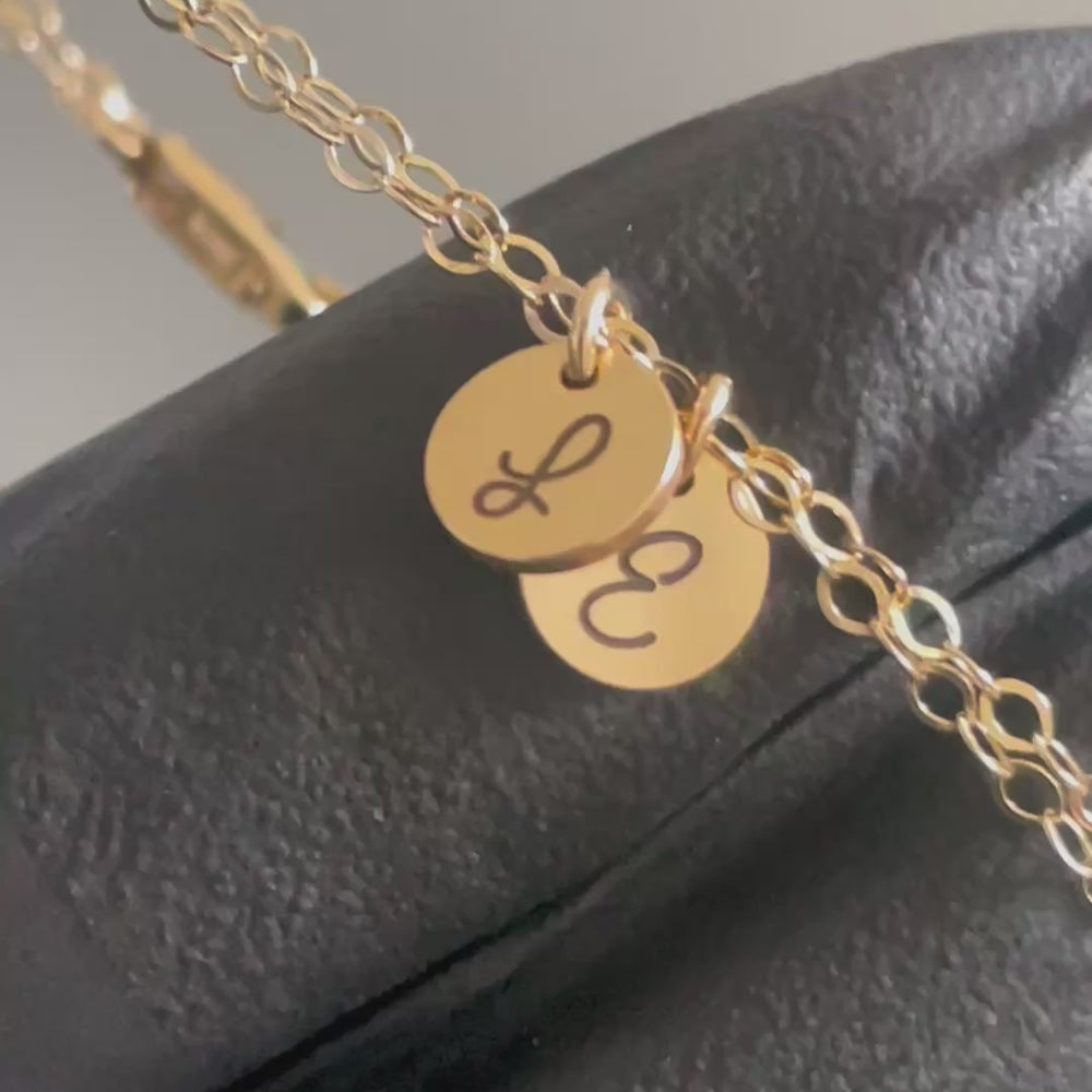 This elegant 14k gold fill double Bella chain bracelet features delicate personalised tiny disks, each engraved one at a time with an initial or tiny symbol of your choice.