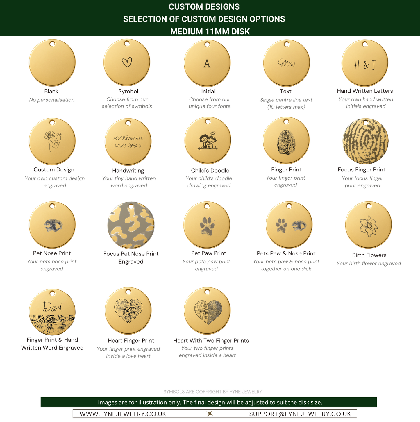 Handcrafted with care, each disk can be personalised with an initial, symbol, fingerprint, or paw print or customised even further with your own handwriting, a custom drawing, meaningful date or unique design.
